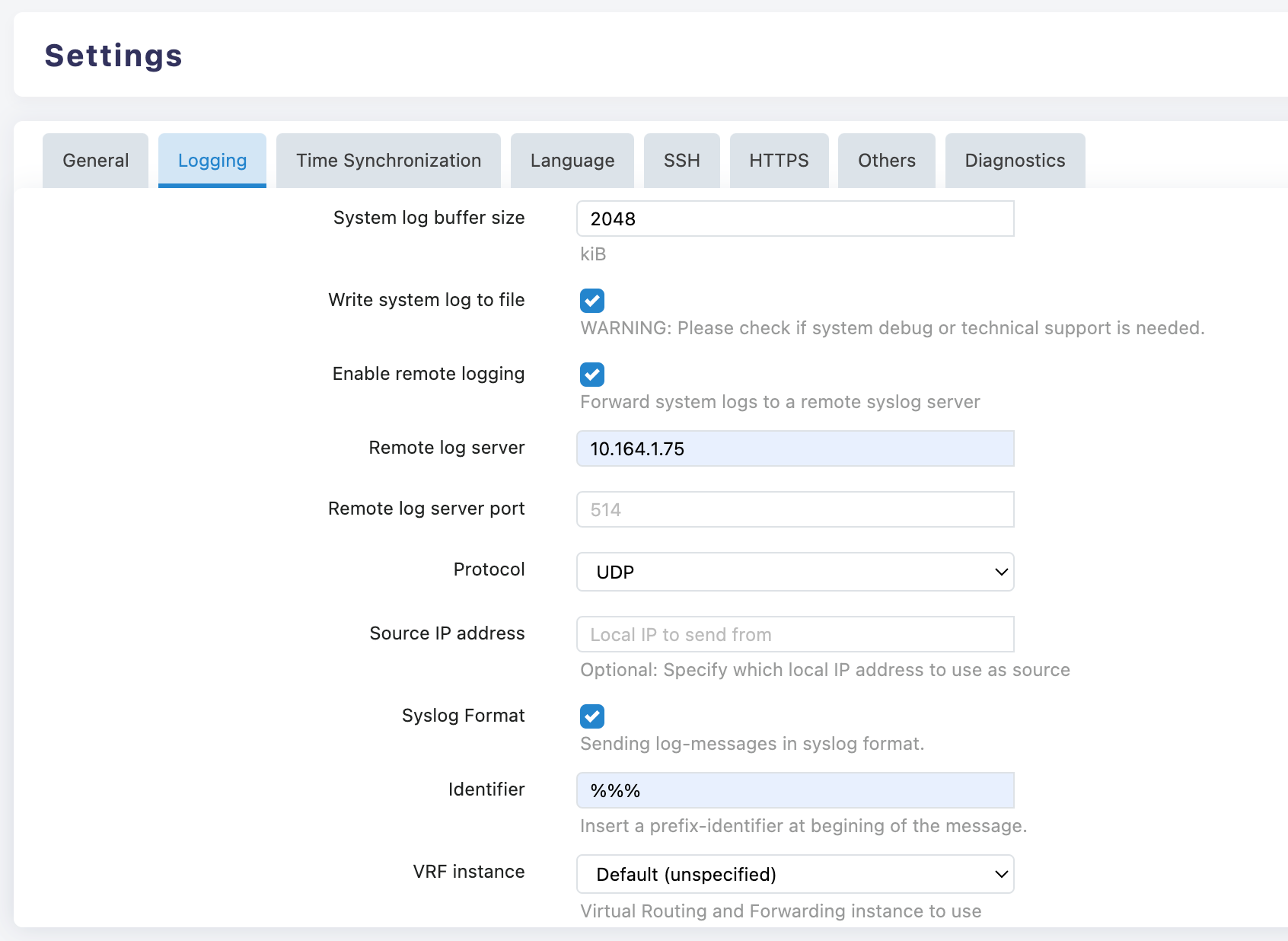 Syslog Format (Standard Format): Enabled, ensuring that logs follow the RFC format for easy parsing and compatibility.
