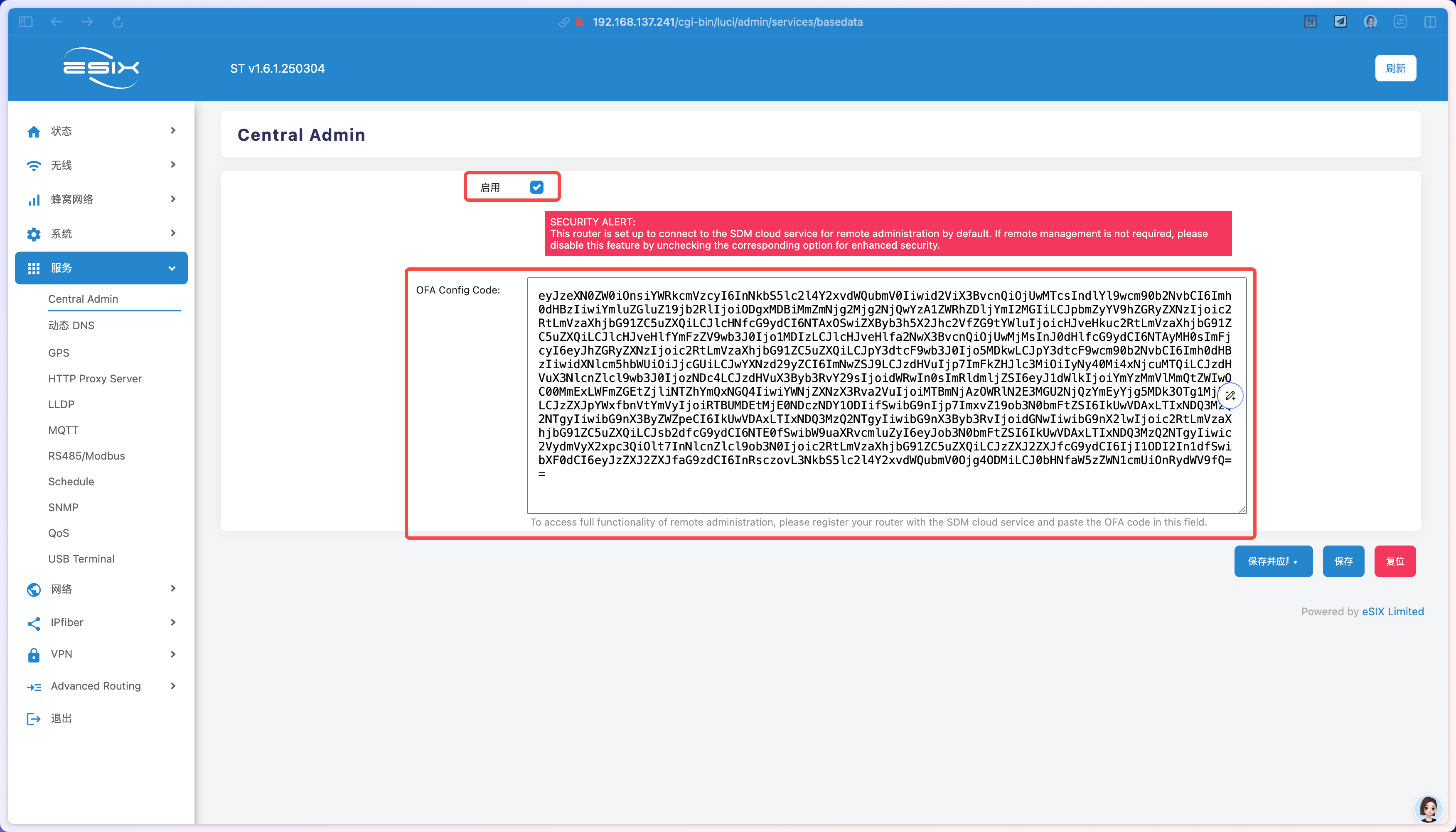 Enter the ENOS Facility Management page, check the 'Enable' option under the 'Services > Central Admin' page, and paste the OFA code.