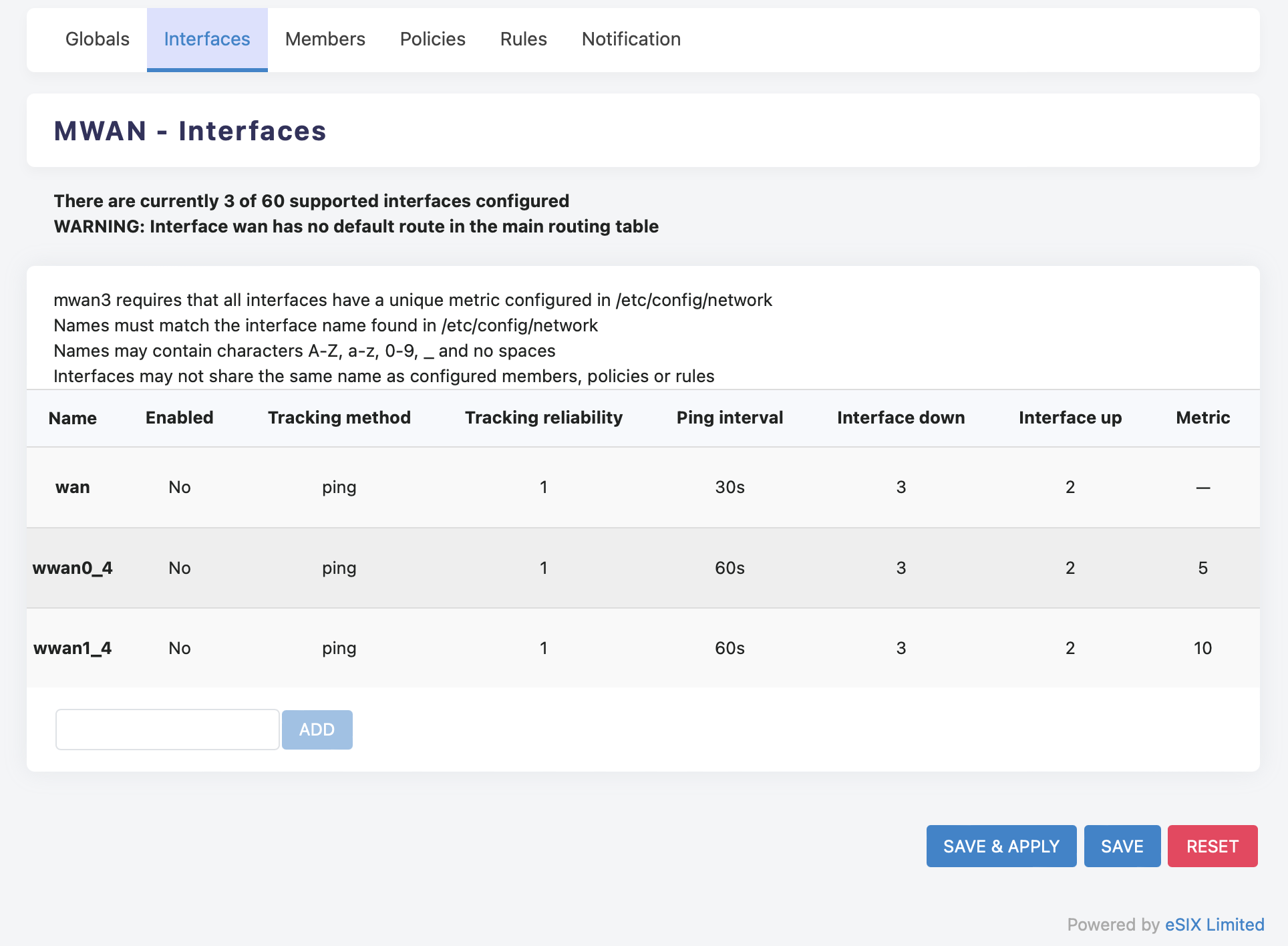 After the installation is complete, refresh the browser, in the top menu bar, go to "Networks-> From the MultiWAN Manager menu, click the Interface TAB. In the MWAN interface list, the system already has wan, wwan0_4, wwan1_4 these three interfaces by default.