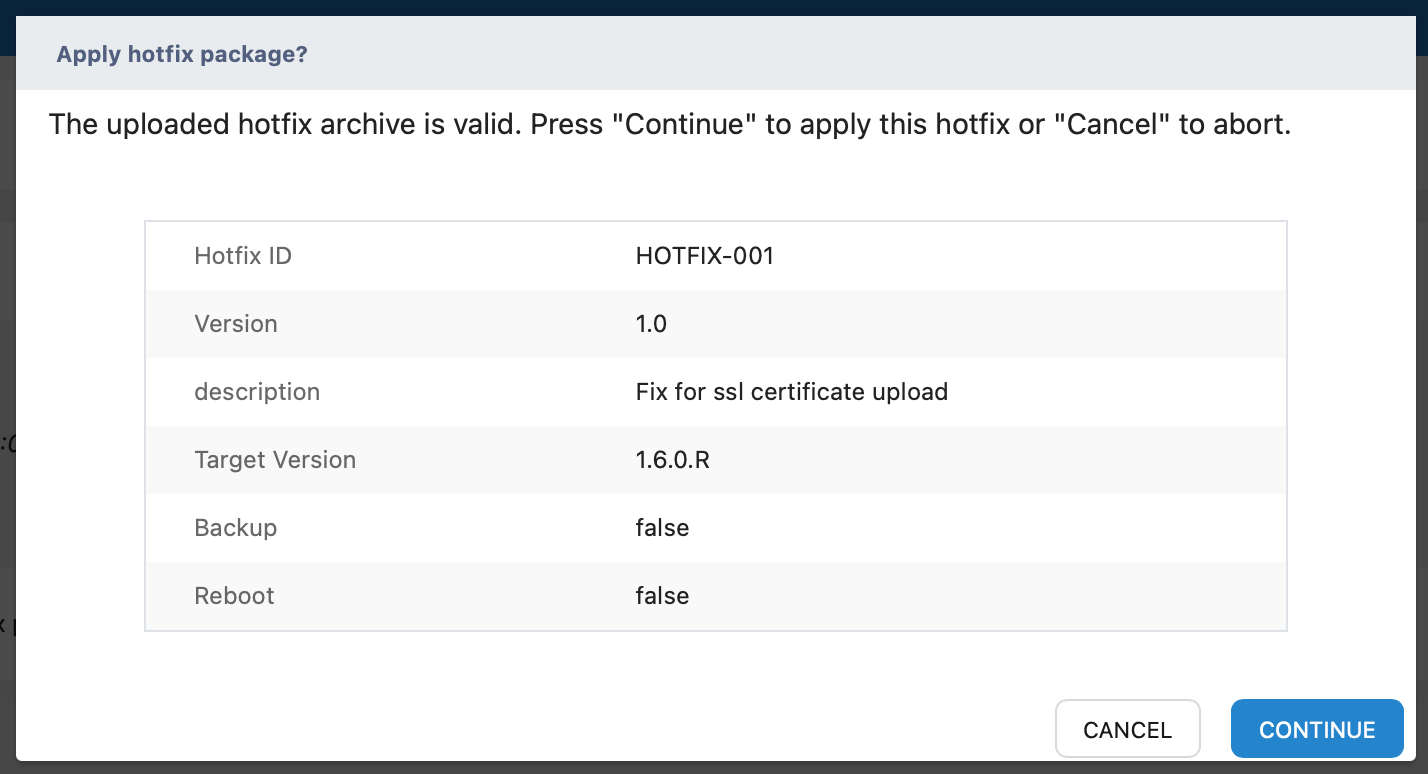 After confirming that the hotfix information is correct, click CONTINUE.