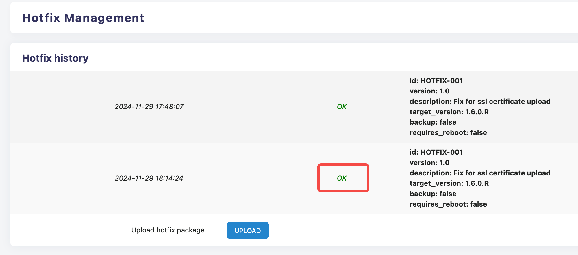 After refreshing the browser page, the historical records of Hotfix will appear. If "OK" is displayed, it means it has been successful.