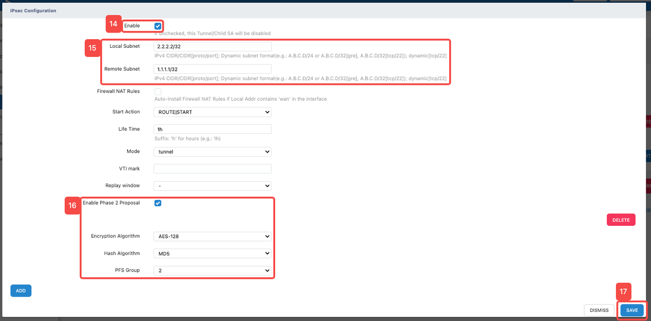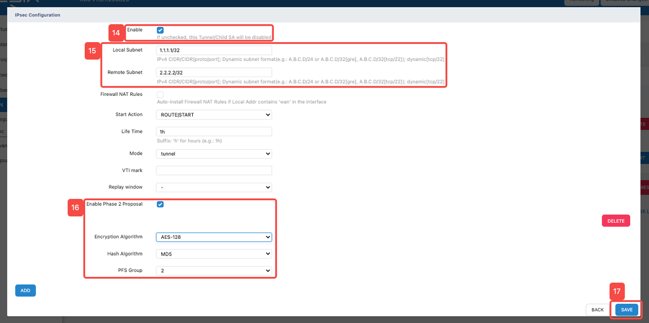- Fill in the destination address in IPv4 CIDR format in "Remote Subnet". (The loopback interface IP address: 2.2.2.2/32 here is only filled in for temporary demonstration. Please fill in the destination address or destination network segment of the data that needs to be encrypted according to the actual situation)