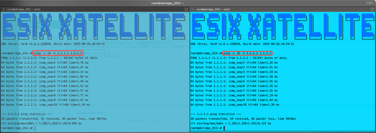 - It can be seen that ICMP packets from Xatellite 5 with IP address "2.2.2.2/32" can successfully reach Xatellite 4 "1.1.1.1/32".