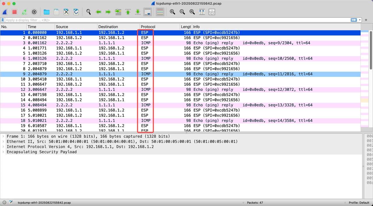 - Through packet capture, it can be seen that encrypted data communication already exists in the IPSEC VPN, where packets related to the ESP protocol are encrypted packets, and packets related to the ICMP protocol are decrypted data packets.